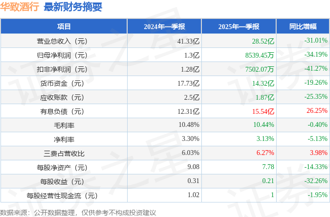 据证券之星公开数据整理,近期华致酒行(300755)发布2025年一季报。截至本报告期末,公司营业总收入28.52亿元,同比下降31.01%,归母净利润8539.45万元,同比下降34.19%。按单季度数据看,第一季度营业总收入28.52亿元,同比下降31.01%,第一季度归母净利润8539.45万元,同比下降34.19%。本报告期华致酒行公司应收账款体量较大,当期应收账款占最新年报归母净利润比达420.5%。